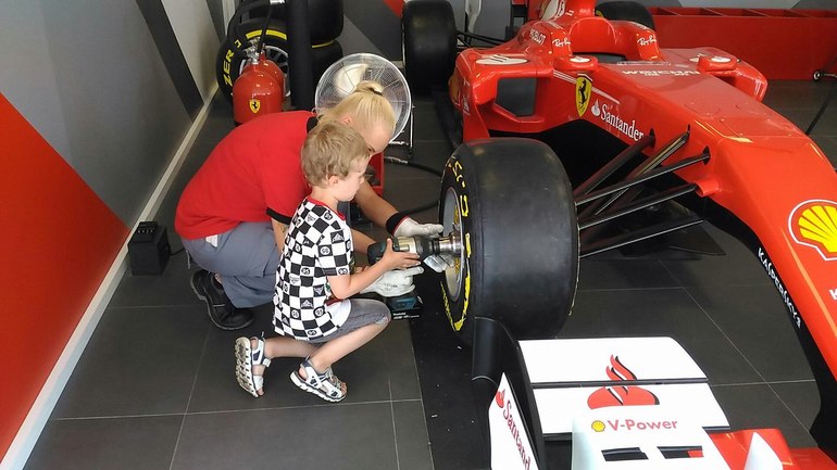 Еще там есть музей, где представлено несколько машин, интерактивный стол, где можно почитать про историю и там же есть зона для фото с настоящими феррари)