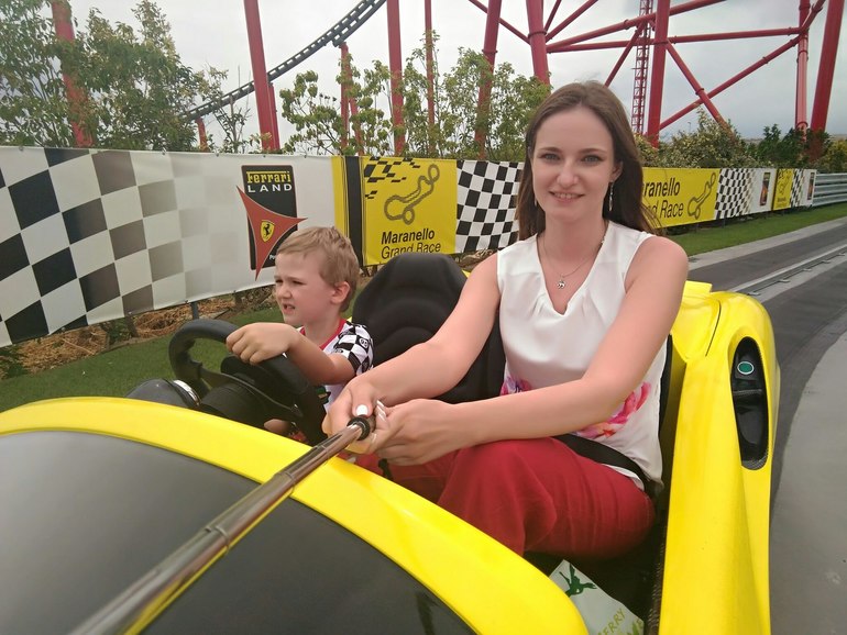 После этого мы отправились в Порт Авентуру. Я еще перед отпуском залезла на их сайт и нашла там специальное предложение для тех, кто в Испании будет в июне, 2 дня Порт Авентура + Феррари лэнд со скидкой. Им и воспользовались. Сначала поехали в Феррари лэнд. Что могу сказать про Феррари лэнд, для 5 лет ранова-то, за билет все аттракционы бесплатно, но в порядке живой очереди, чтоб покататься на машинках, в очереди надо отстоять больше 2ч, можно купить доболнительный билет на проход вне очереди, но стоит это прилично. Чтоб нам вдвоем сесть на 1 машинку, нужно все-равно 2 билета, получается вообще феерично дорого за проезд в течении пары минут на машинке.
