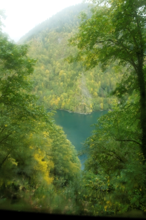 Следующий пункт - конечно же озеро Рица. т.к. мы были на микроавтобусе, то смогли подняться выше озера, туда, куда большим автобусам дороги нет. Правда там такой серпантин и обрывы, что дух захватывает. Но зато вот такой вид на озеро