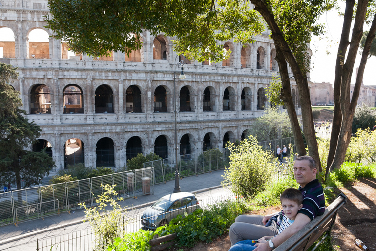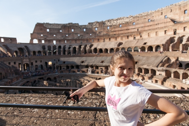 В Колизей мы тоже попали достаточно просто и быстро, людей в очереди в кассу было мало. Мы поднялись на самый верх на лифте, прошли по стенам древнего театра, увидели отреставрированную арену. Потом постепенно спустились вниз, все рассматривая. Костику было интересно, а Ира римской историей не особо впечатлилась, она ей на уроках надоела.
