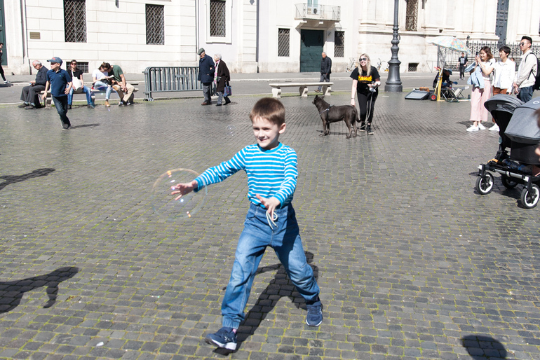 Мы прошли по древним улочкам, дошли до фонтана Треви, по пути заглянули в Пантеон и послушали выступающих рядом музыкантов... Неподалеку от площади, где много творческих людей, дети затребовали мороженое. Потом они ели его возле одного из фонтанов, а мы грелись на солнышке. Увидев аниматора с мыльными пузырями, Костя не устоял и побежал их ловить...