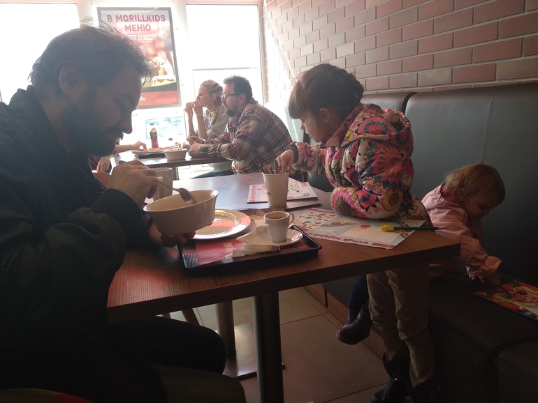Во 2 половине дня остановились в кафе полпути,сайт у них был шикарный,но по сути это столовая,с детской комнатой, правда условия хранения столовых приборов меня не вдохновили, Аню не стала там кормить,дала детское питание. Все остальные были довольны