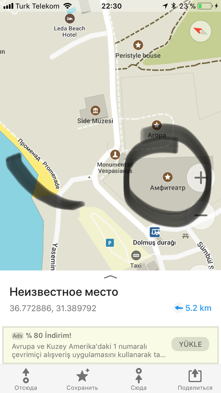 Европа.Кто бывал неоднократно или/и хорошо представляет местность в районе античных развалин. От них в сторону Анталии по карте указан променад