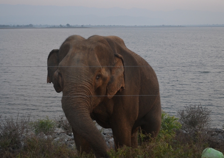 Однажды мы решили поехать в национальный парк. Их на территории Шри-Ланки много, самыми известными являются Яла и Удавалаве. Мы решили поехать в Удавалаве, нам туда было ближе. Походив по Тангалле и порасспрашивав местных жителей, выяснили, что можно договориться прямо с ними и поехать хоть на тук-туке, хоть сразу на джипе. Въезд на территорию парка только на джипах, то есть тук-тук все равно пришлось бы бросить, поэтому мы решили сразу ехать на джипе. Около 5 утра за нами заехал водитель и мы отправились в путь. Ехать до парка около полутора часов. Подъезжая к парку мы увидели слона, который подошел прямо к ограждению.