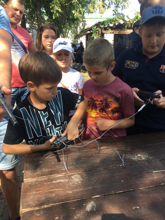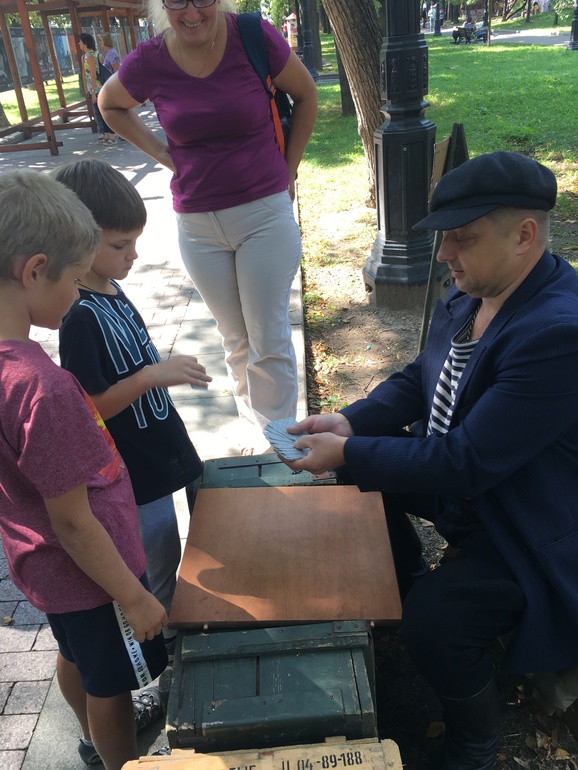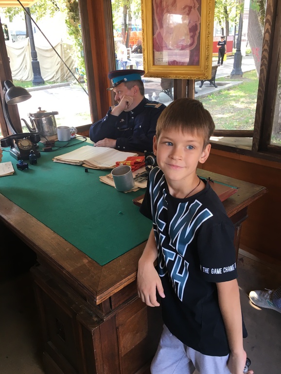 Ну идем дальше. Мне больше всего запомнилась локации - начало ХХ века глазами Антоши Чехонте (номер 13) и московский уголовный розыск (номер 14). Зашли в будку к дядечке-сыскарю или кто он там. А там перо и чернильница и дети пишут что-то. Друг сына спросил дядечку, а что писать-то? На что дядечка ответил, напиши спасибо маме! Вот когда ты в последний раз говорил маме своей спасибо? А мама дала тебе жизнь, мама вот водит тебя по всяким интересным мероприятиям, не говоря, что кормит тебя и одевает. Короче, правильные и хорошие вещи, говорил товарищ! Друг сына написал: "спасибо за жизнь", ну а мой просто имя и фамилию, типа Тимур уже все сказал. А еще мы "развели" карточного шулера на полчаса всяких фокусов и шулерств с картами, улыбались как дети. Мужчина и сам, видя, что людям нравится, предлагал все новые и новые действа с картами. Про остальные "точки-локации" не буду, все интересны по своему.)