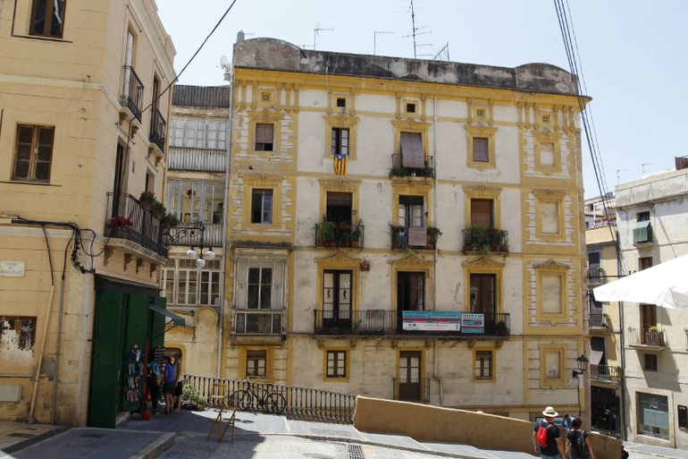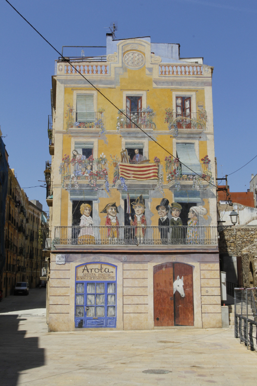 и еще одна узнаваемая достопримечательность Таррагоны - дом с обманным фасадом автор этой стены - Карлес Арола. он изобразил на балконах этой стены популярных в Испании персонажей.