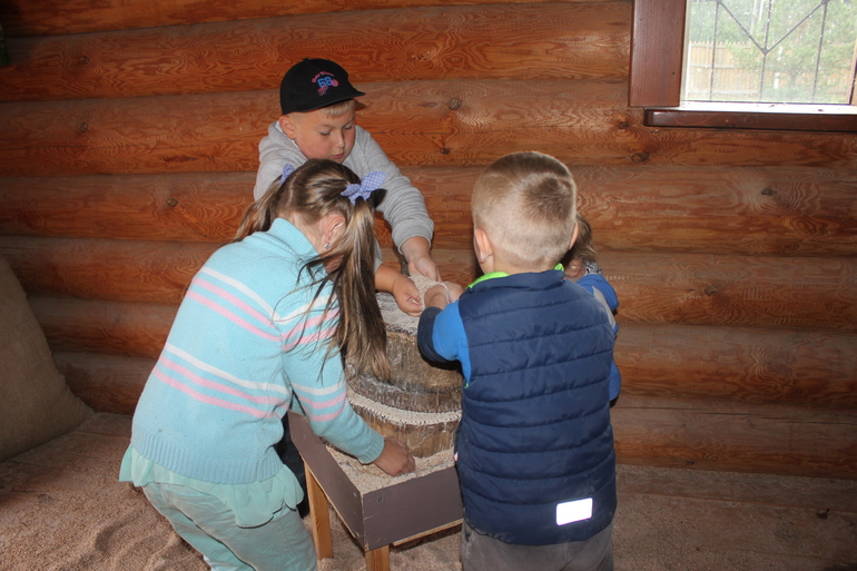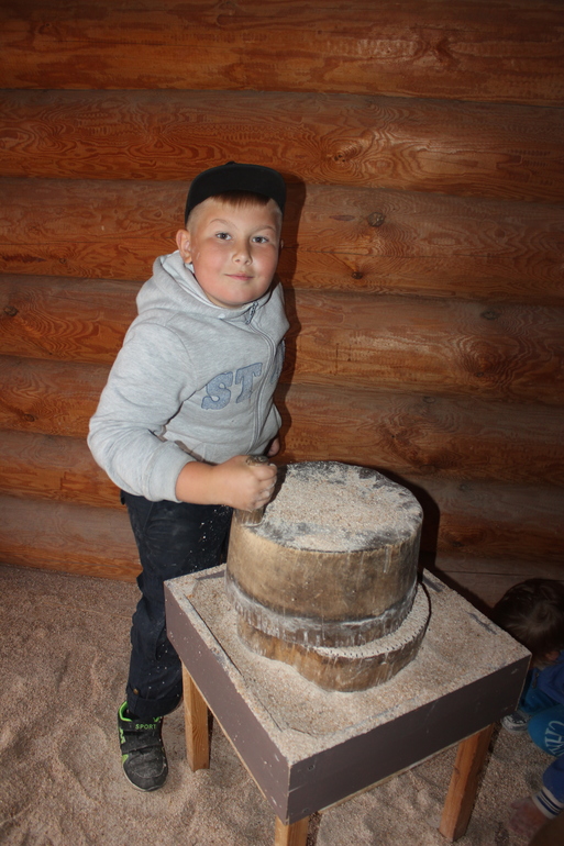 Больше всего детям понравилось в амбарах. как сказал Славик:"Вот он антистресс!" Огромный амбар с большим количеством зерна, там и пшеница и гречиха и рожь, и овес и кукуруза. Все потрогали, все рассмотрели, а дальше ребята начали усердно перемалывать зерно в муку. Вот тут то мы и застряли на долгие 30 минут. Мы сидели в беседке, а они все вместе мололи и мололи.