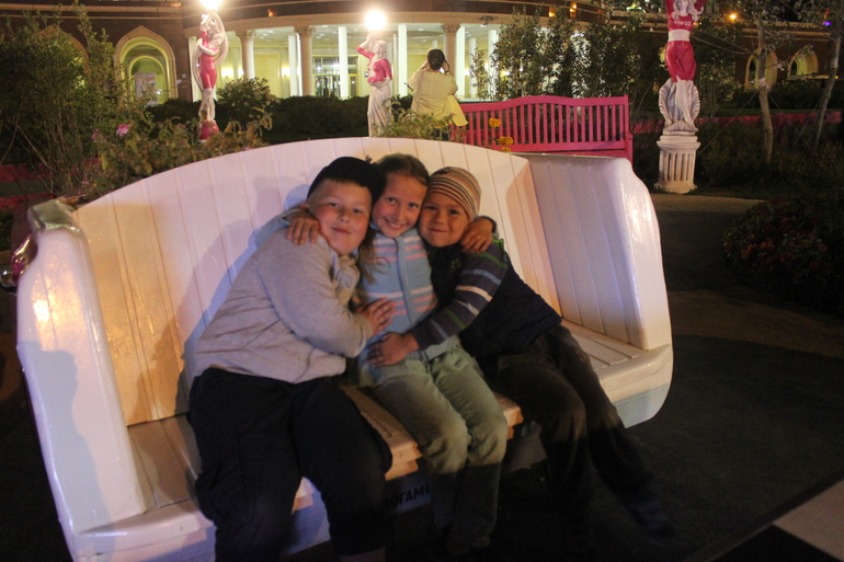 нагулялись мы от души. Не успели сесть в машину, как дети вырубились, так мы и доехали до Казани. но путь наш лежал не домой, а к театру Экият. Уж больно хотелось увидеть его в ночной подсветке. Это невероятно красиво.