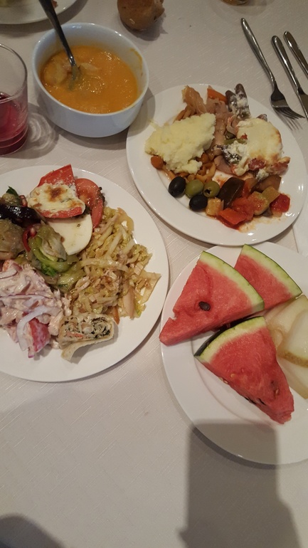 б) Ужинать ( а кому-то и полдникать) здесь можно в 5 ресторанах по меню. Здесь мы сэкономили... Меню выглядит очень аппетитно и разнообразно, но мы просто не могли больше есть😅 .