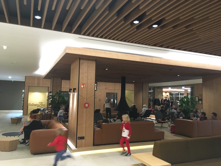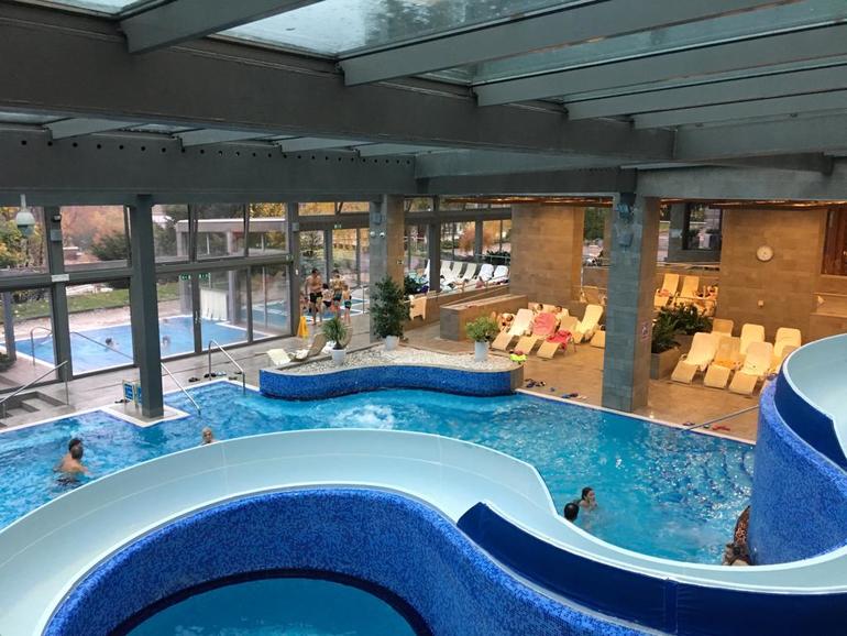 Помимо бассейнов с обычной водой есть также один на улице с потрясающим видом на озеро и Замок, и две гидромассажные ванны с горячей водой. Мы, как водится, попробовали все и еле уговорили старшего пойти на ужин. Ужин мне тоже понравился: