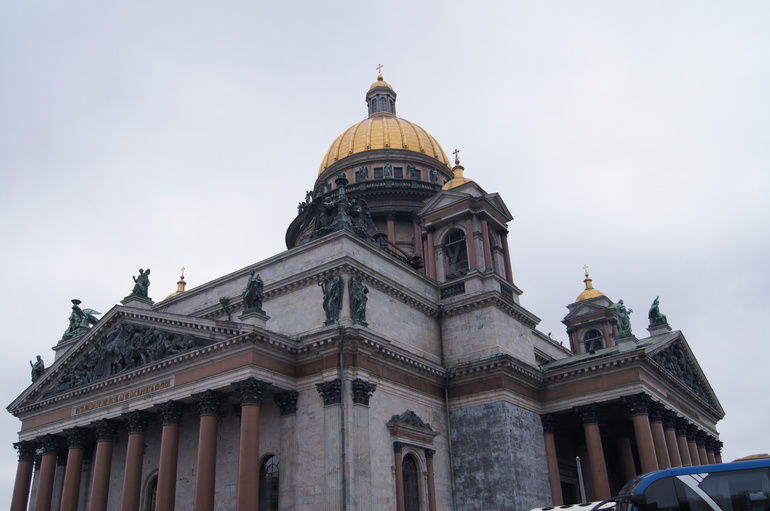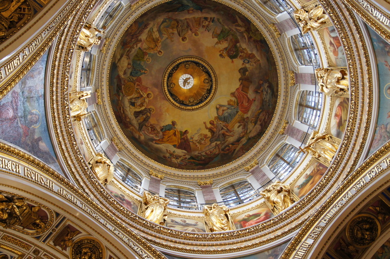 Исаакиевский собор. Еще одно грандиознейшее и монументальнейшее сооружение Питера. Опять же пострадало во время ВОВ, фасаду досталось не сильно, а вот купол пробило и в течение 3-х лет во внутреннее пространство попадали осадки. Впоследствии восстанавливали зарубежные реставраторы, на тот момент у нас не было специалистов, которые могли выполнить нужные работы по восстановлению икон и других элементов убранства собора. Поднялись на колоннаду, страшно-боюсь высоты, ветер свистит, ограждения хлипенькие, под ногами досочки скрипят, у сына зубы стучат, но то, что открылось перед глазами стоило дрожащих коленей. Диаметр купола 25 метров, мы его обошли по кругу, помимо красот Петербурга с высоты птичьего полета, усмотрели какое-то едальное заведение на крыше, возникла мысль посетить его, пообедать, но потом, видно, ветром выдуло.))