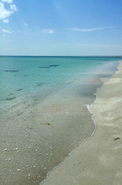 Это км 70 от Евпатории. В сторону черноморского и вниз от дороги. Мы даже далеко не поехали, вглубь косы, где-то на первом км свернули вправо. Машину пришлось оставить, там глубокий песок, вязнет. Пешком метров 150. Вначале была ещё одна семья, потом они уехали и мы остались совершенно одни.... Это такой был восторг. Мне кажется, я такого никогда не видела. В моем рейтинге это пляжи первого призового места.