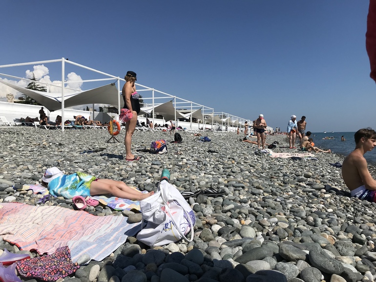 Все побережье Сочи булыжники. Кто не хочет гальку - туда не едет. Там не совсем плохо, я думала будет гораздо хуже.