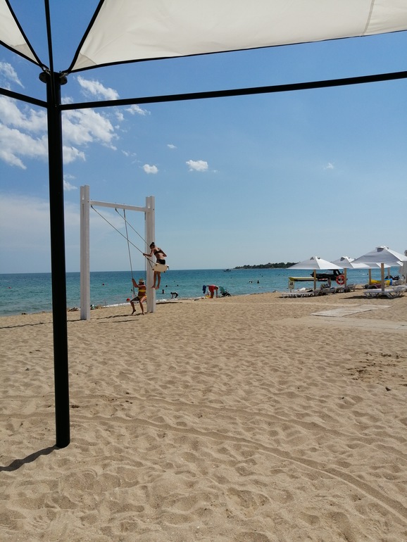 В Заозерке пляжей немного "несанаторских". Мы ходим на Арго. Первый год его обустроили. Ну уже прогресс- туалет, раздевалки, кафе, шезлонги-зонтики. Хорошо.