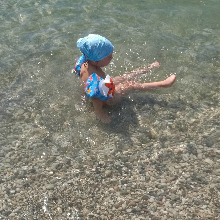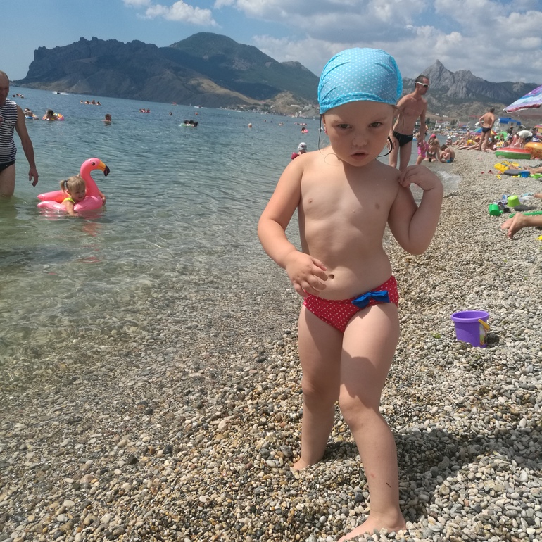 Вода здесь чистая..в море песок, а на берегу мелкая галька.