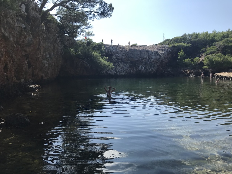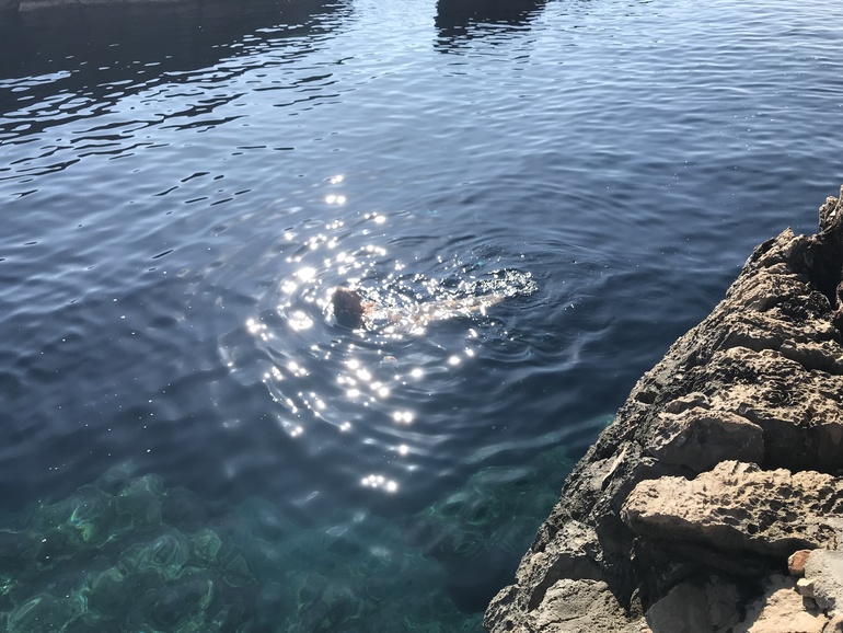 Пляжа там нет, только лестницы со скал. Мы пошли на солнечные камни. Там вдоволь напрыгались вниз в воду.