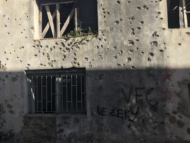 В Мостаре до сих пор видны последствия войны. Почти все дома со следами от пуль, многшие дома до сих пор не восстановлены. Вот представьте, идёте вы по Арбату (или любой другой центральной улице Вашего города) и видете такое: