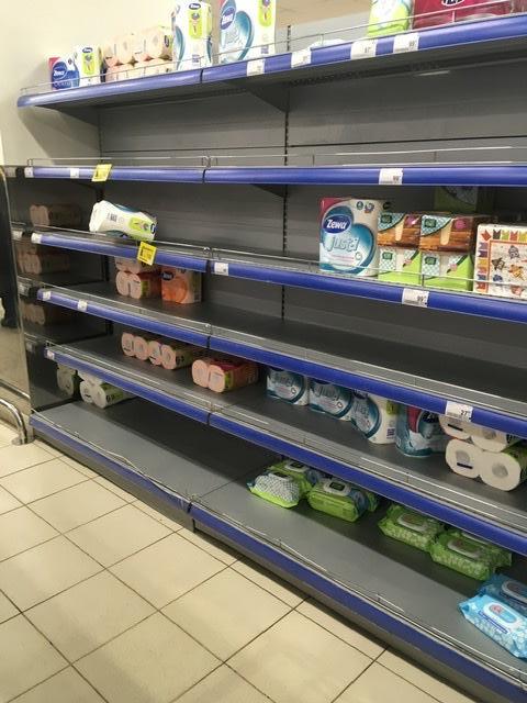 у нас позавчера в пятаке была такая же полка с туалеткой, но вчера уже полная. Но заметьте, дорогая-то бумага стоит)) сметают только дешевую. касаемо отпуска - да не проблема кого-то попросить сходить в магаз и купить продуктом, чтобы с голода не умереть) Это жесть, что сейчас происходит!