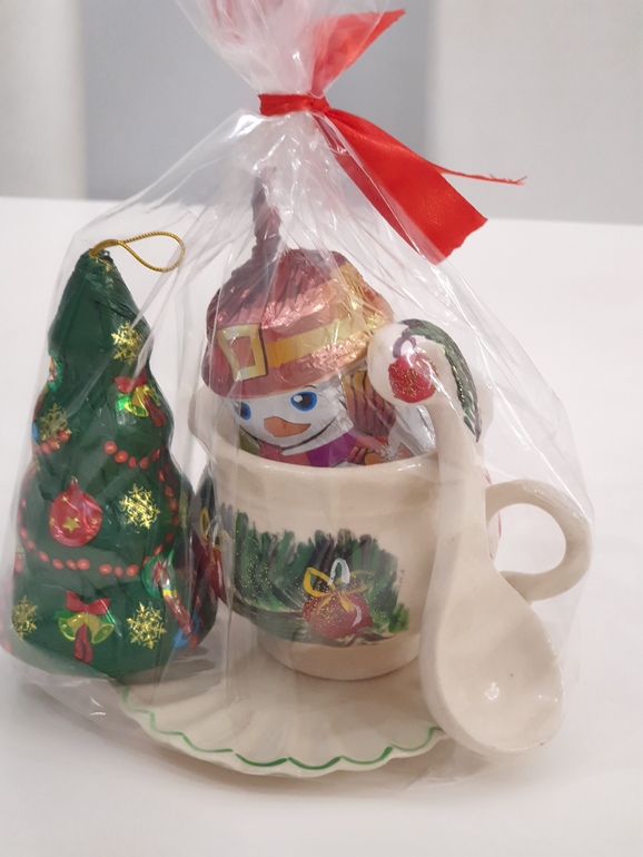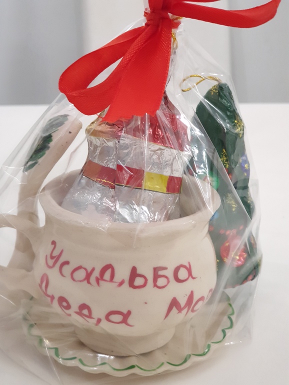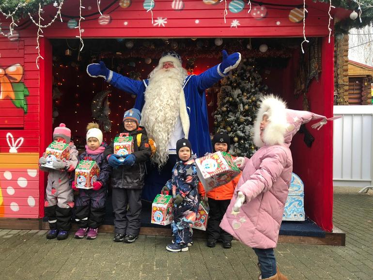 Дед мороз подарки ( конфеты) вручает, подарки рисунки у детей берет, фото с детьми делает.