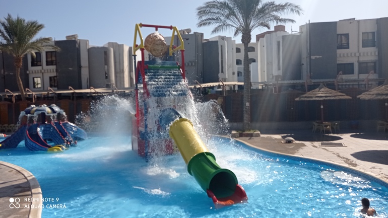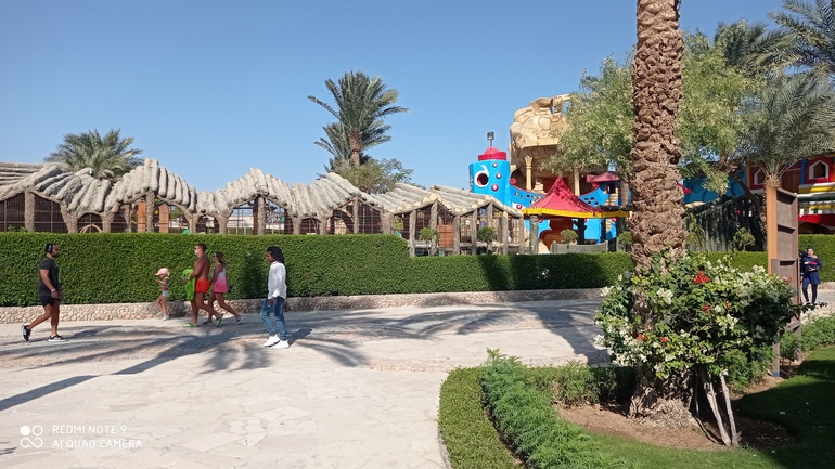 Отель в туристическом центре. На территории минизоопарк, аквапарк, два пляжа, три бассейна, один тёплый. Ребенок доволен. Все, как заказывала: тусовка, море, минидиско, верблюд, коняшка и даже еда по её словам супер.