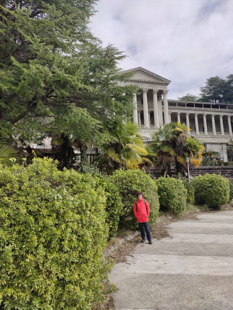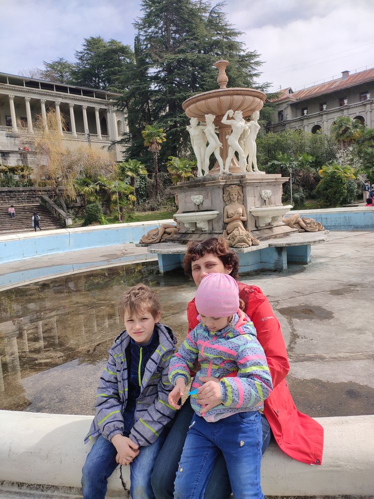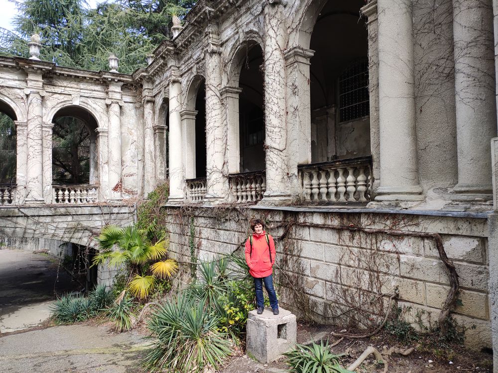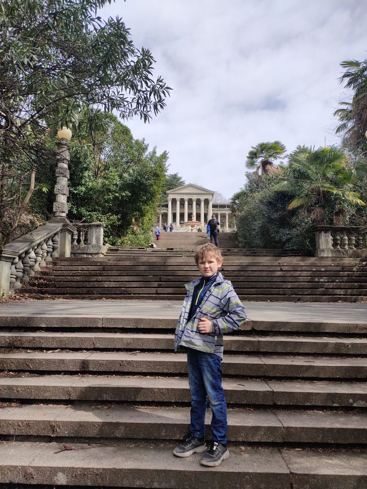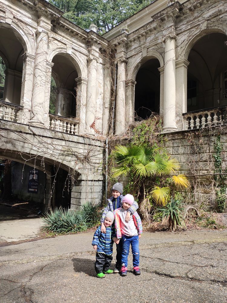 Ездили в заброшенный санаторий Орджоникидзе - видимо из-за хорошей погоды в этот день народу там было как на Красной площади в Москве. Мы думали там никого нет и заходить нельзя - тихонько перелезли через забор в кустах - а оказалось открыт центральный вход :) до санатория от Дендрария можно пройти по тропе здоровья - примерно час хотьбы с детьми