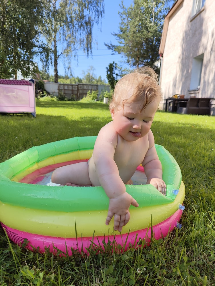 А потом в ход пошёл бассейн: малышковый, надувной (тот самый из Марокко), но эмоций — на океан. 💦 Плескалась, визжала от восторга, поднимала фонтаны воды и периодически пыталась вылезти наружу, чтобы снова занырнуть... или сожрать полотенце — кто знает, какие у неё там были цели.