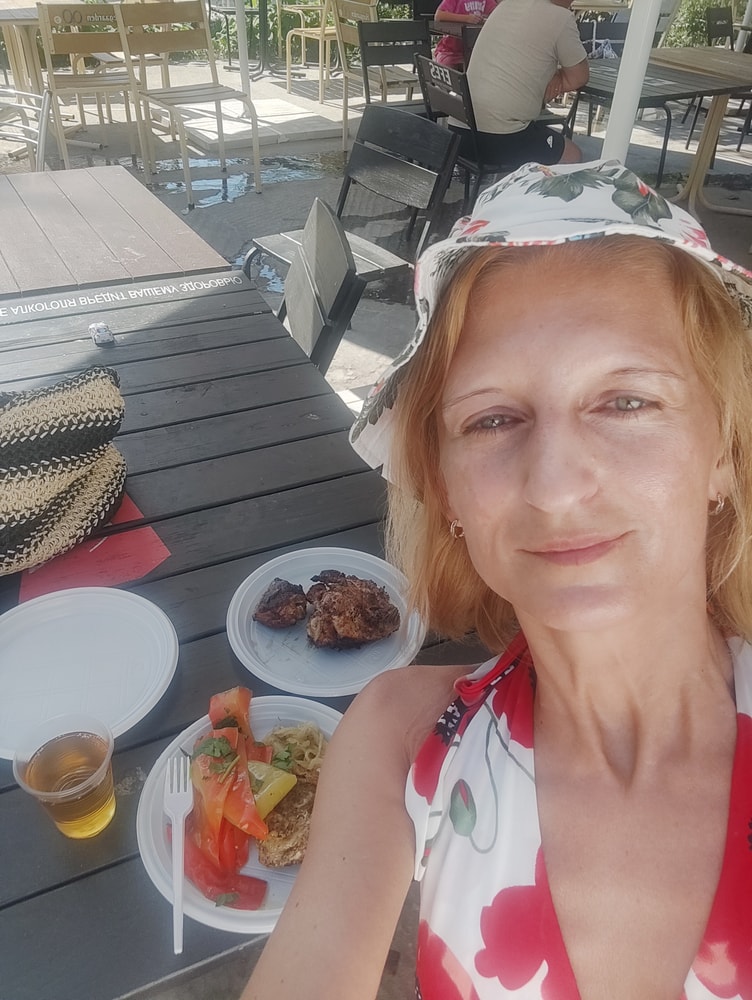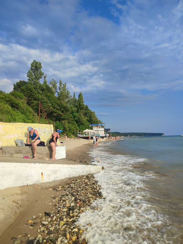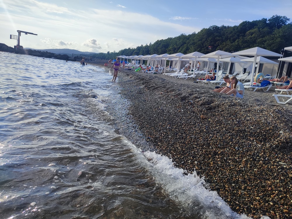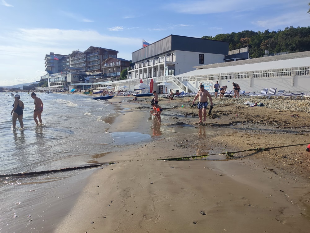 Но самое главное конечно пляжи. Писала в прошлом посте что на входе чуть галька, потом песок, пологий вход как в Орленке. Когда штормило нанесло пару дней совсем чуть водорослей и немного медуз. Но вообще стабильно чисто. Водоросли работники быстро сгребли и убрали.