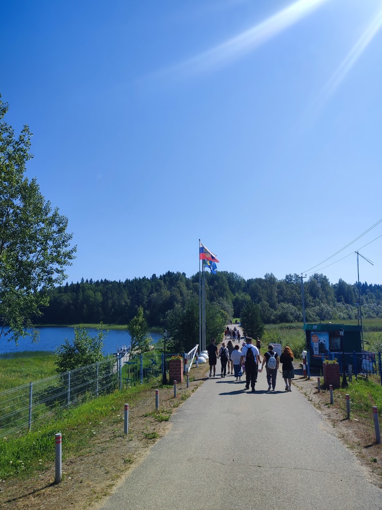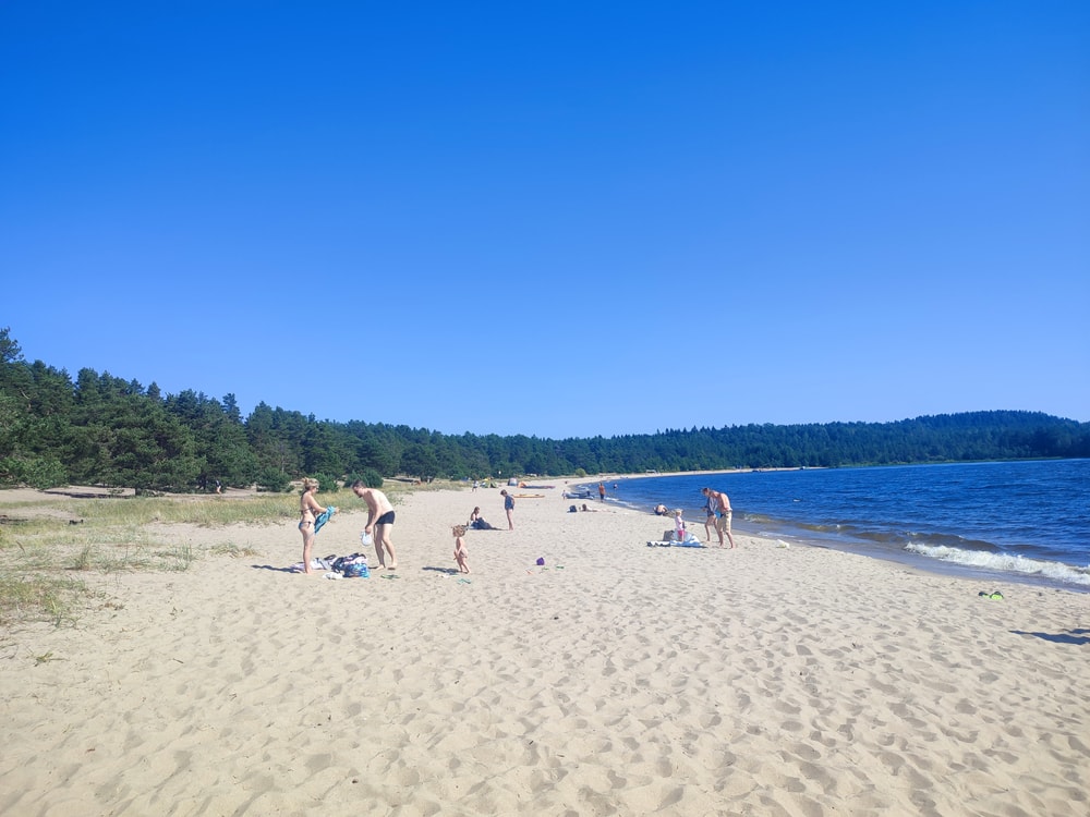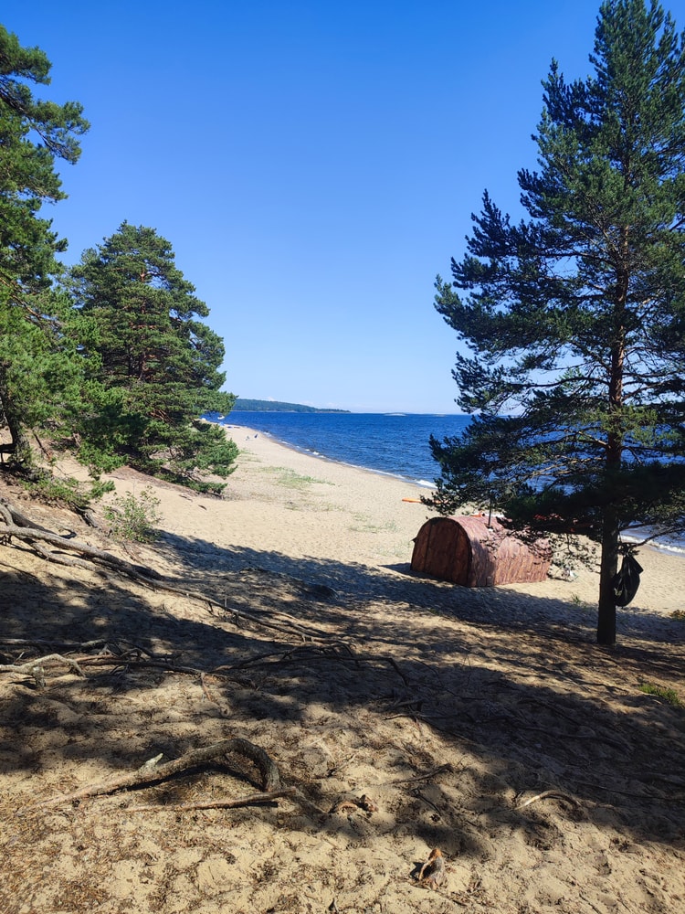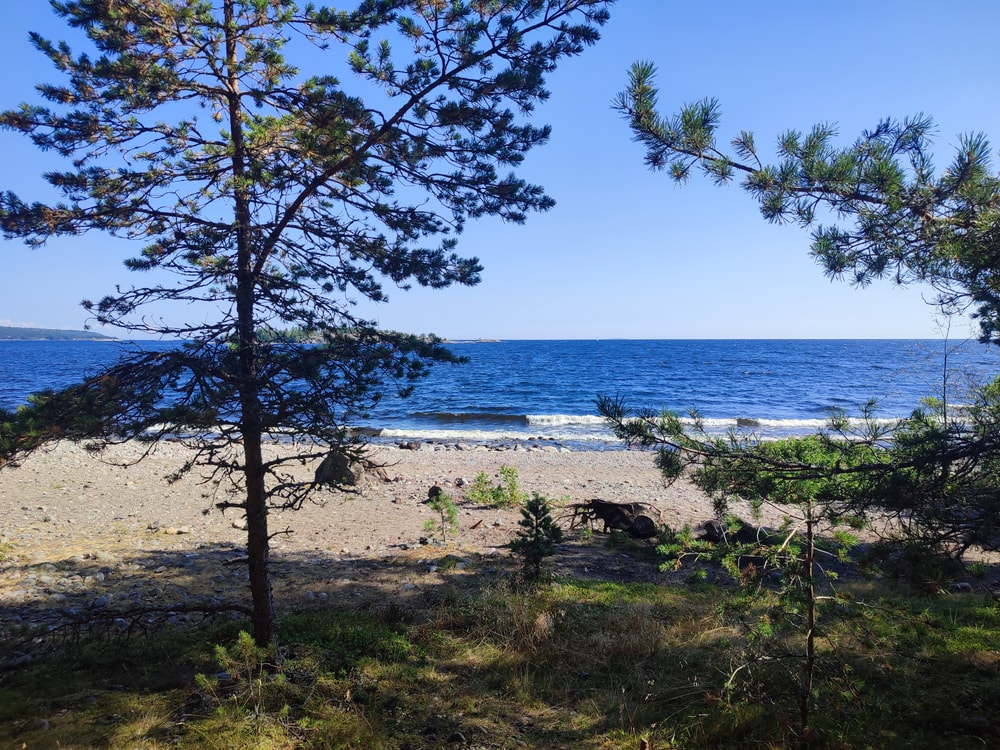 На остров есть проезд мост, но на машинах не пускают, есть машина и катера для заброски. Много людей в палатках, есть семейный лагерь палаточный Секретный остров. Три отличных песчаных пляжа, много черники и брусники( еще не спелая). Мы его весь прошли с экскурсоводом, смотрели на Ладогу, на лес, на смотровые площадки, вода в Ладоге вполне теплая.