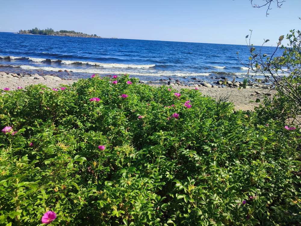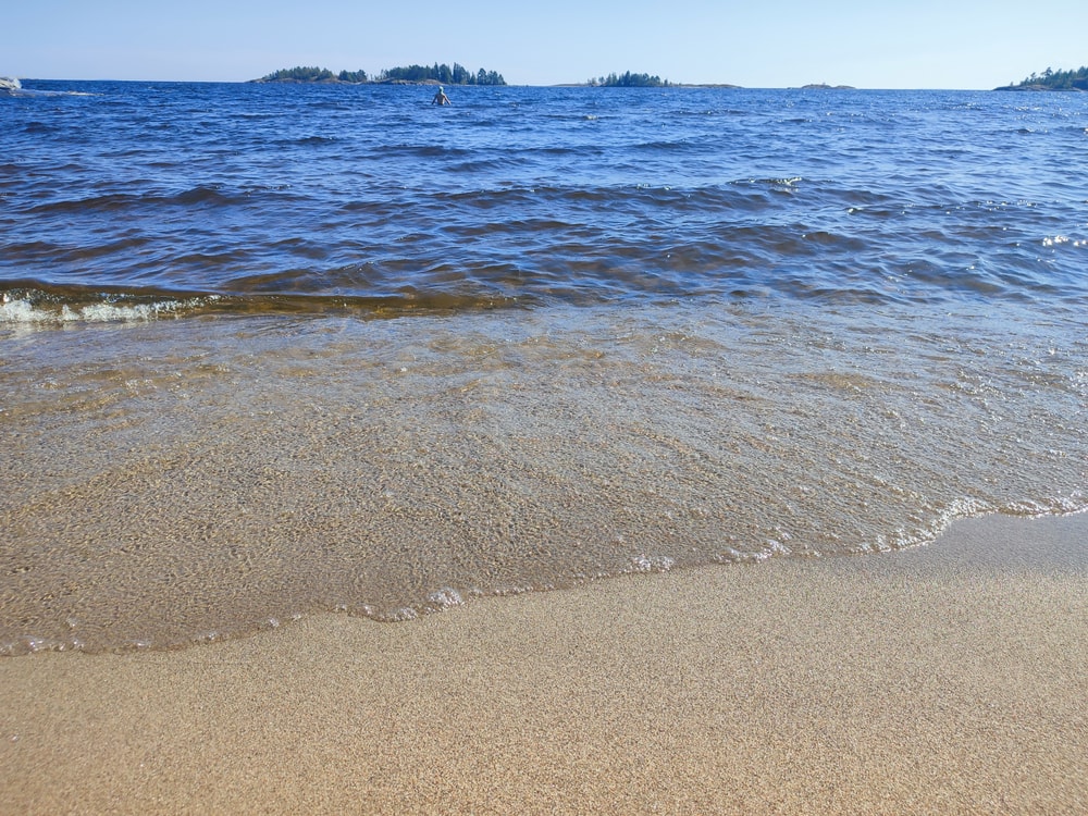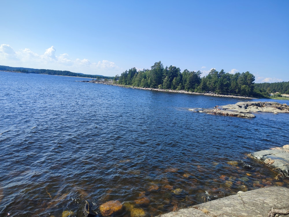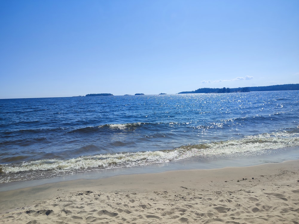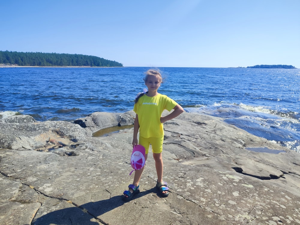 На остров есть проезд мост, но на машинах не пускают, есть машина и катера для заброски. Много людей в палатках, есть семейный лагерь палаточный Секретный остров. Три отличных песчаных пляжа, много черники и брусники( еще не спелая). Мы его весь прошли с экскурсоводом, смотрели на Ладогу, на лес, на смотровые площадки, вода в Ладоге вполне теплая.