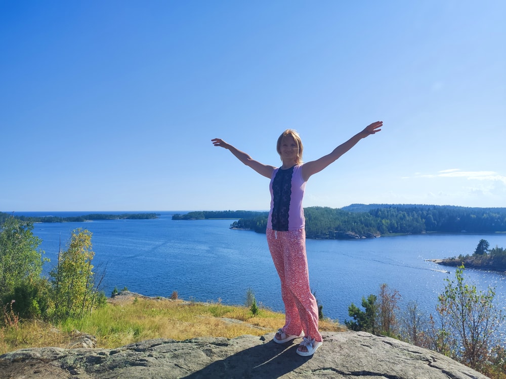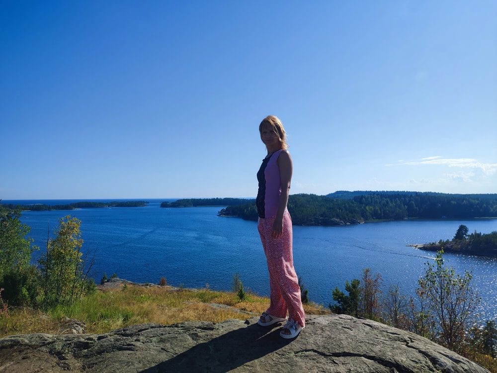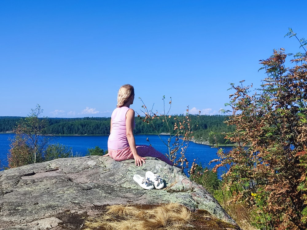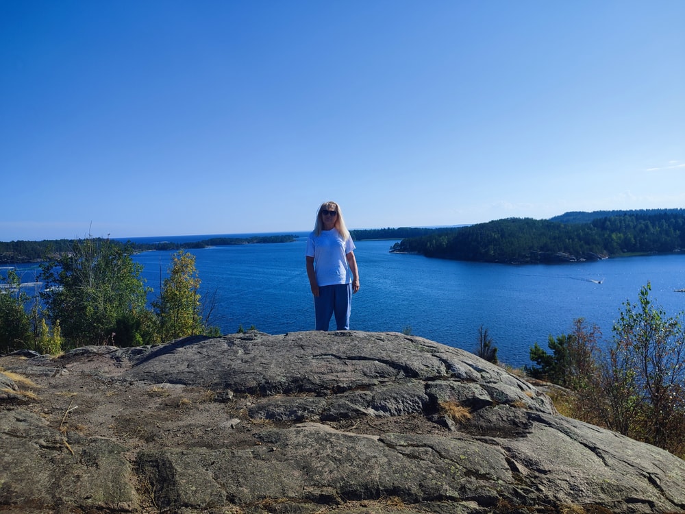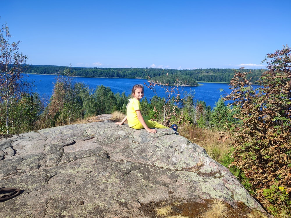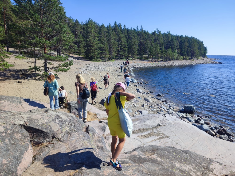 На автобусе в общей сложности были часа 3,5. Залезли на три горы с красивейшими обзорами, посмотрели два острова,часть шхер, покупались в Ладоге, прошли пешком 7-8 км, наелись черники, узнали о Карелах их жизни, откуда взялись, кого вытеснили, обычаях, изменениях в религии, быте.