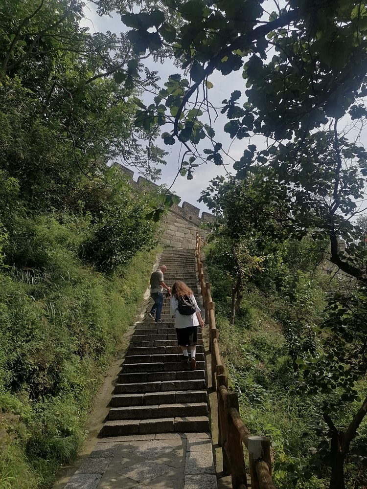 В 11 часов за нами приехал гид (заказывала на Трипстере за 234 доллара), китаец, довольно неплохо говорящий по-русски. И мы поехали на Великую китайскую стену. Участок Мутяньюй самый туристический, я боялась, что будет много людей, к счастью, мои страхи не оправдались. Наверх поднимает фуникулер, но мы лёгких путей не ищем, пошли пешком. Тяжело, высоко, крутые лестницы. Жарко и влажно. Почувстуй себя строителем ВКС, называется)) Но ничего, поднялись)
