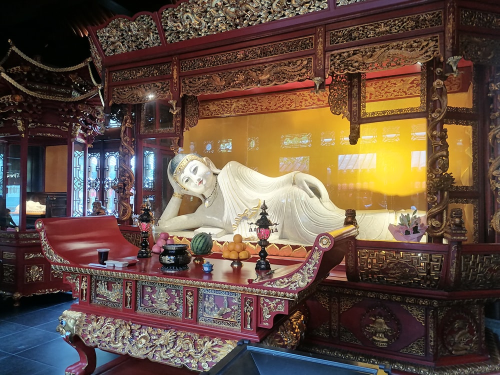 Храм нефритового Будды был основан в 1882 году, и тогда же монах-настоятель привез из паломнической поездки из Бирмы две статуи Будды. Ценны они тем, что вырезаны из цельного нефритового камня. Один Будда лежит, символизируя уход в Нирвану, второй сидит, медитируя. Сидящий Будда ценится больше, он запрятан в помещении на задворках, не каждый доберется, и фотографировать его запрещено. Лещащий более доступен, но здесь тоже есть своя хитрость: в одном помещении находятся две лежащие статуи - большая и маленькая, около 60 см в длину, так вот ценная та, что поменьше. Кто не знает, до маленькой не доходит, я тоже попалась, хотя маленькую статую видела, вон она виднеется слева на фото)