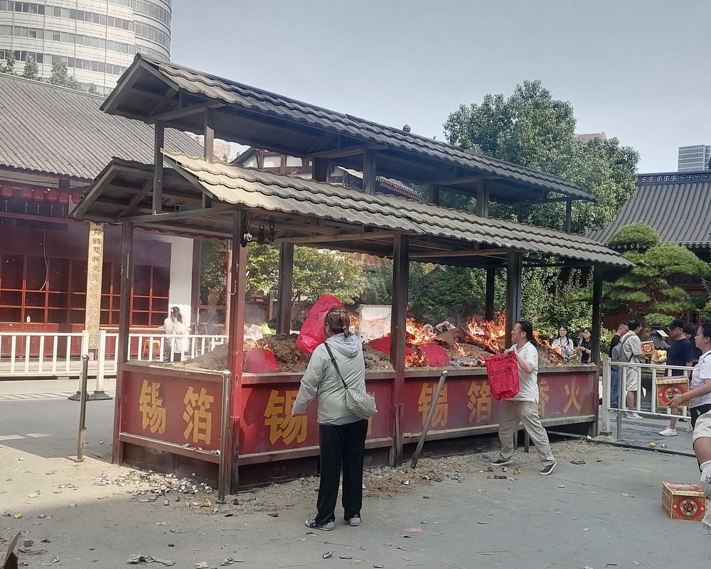 А еще очень много людей сидят на скамейках под навесами, и складывают в большие красные бумажные пакеты или красивые красные коробки много-много серебристых бумажных "корабликов", а потом несут эти пакеты и коробки и бросают в специальный костер. Не смогла найти в интернете, что означает этот обряд, может кто-то знает?