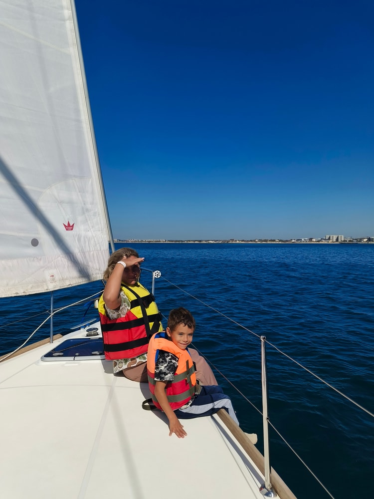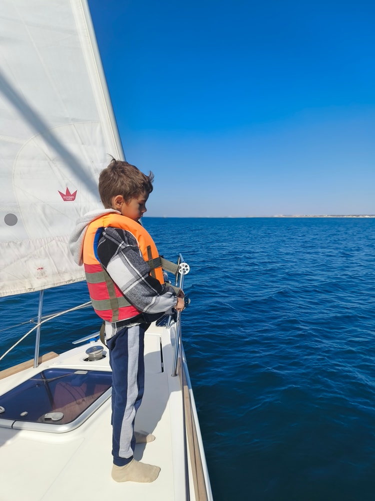 Вообще прогулка на яхте мне внезапно очень понравилась. Ход под парусом очень мягкий, топливом не воняет (как при катании на катерах), не укачивает, и такая романтика прям... Переживала, что Марк будет бояться передвигаться по яхте, но он спокойно самостоятельно залезал на нос, к парусу, просто лазил по ней, в е разглядывал, в общем, вел себя как заправский моряк.