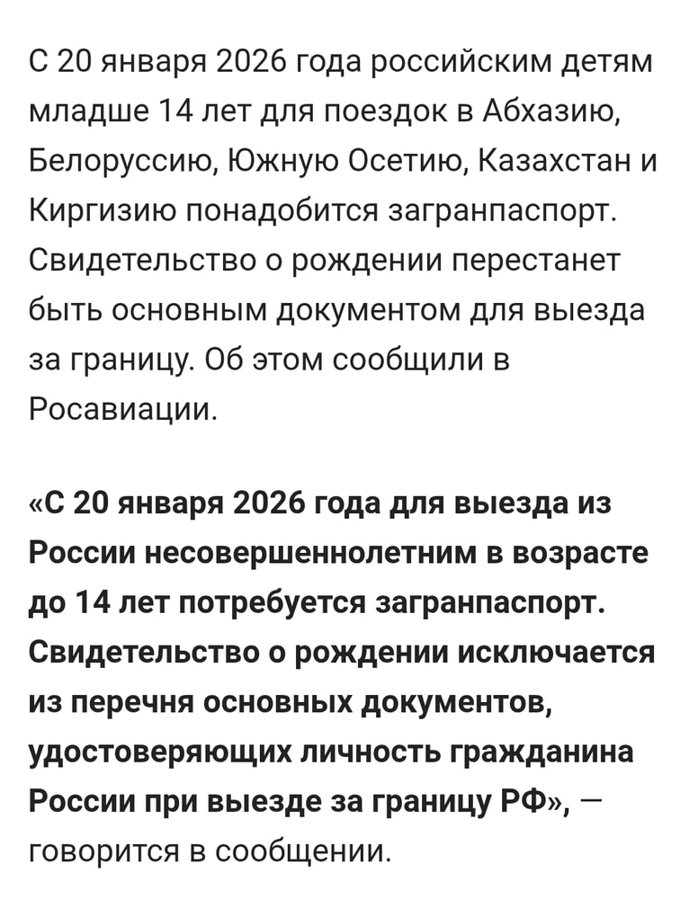 Загранпаспорт и виза! Другие документы.Вдруг кто-то не в курсе, в Абхазию, Беларусь, Казахстан дети с 20 января только по загранпаспорту. Скриншот с life.ru