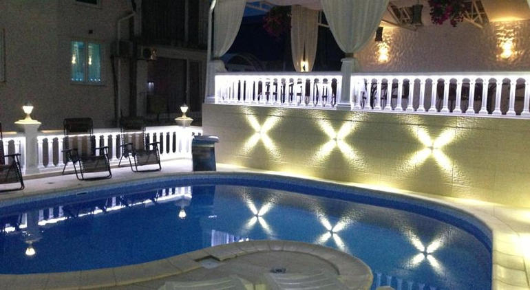 • открытый бассейн, имеет подсветку и водопад, а также укомплектован шезлонгами, лежаками и зонтами;