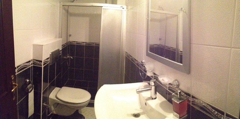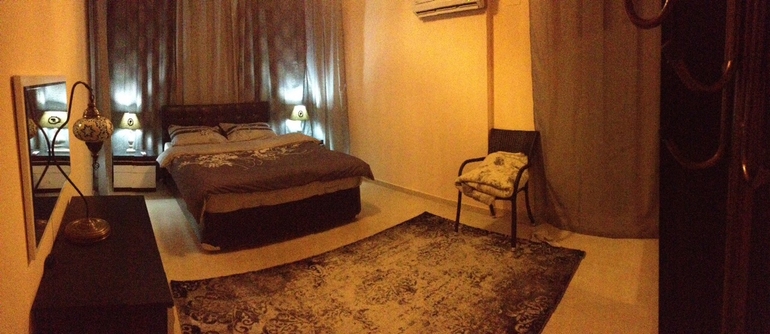 Три спальни:две с двуспальной кроватью и собственными санузлами и одна с полуторными, три санузла: два в спальнях, один гостевой