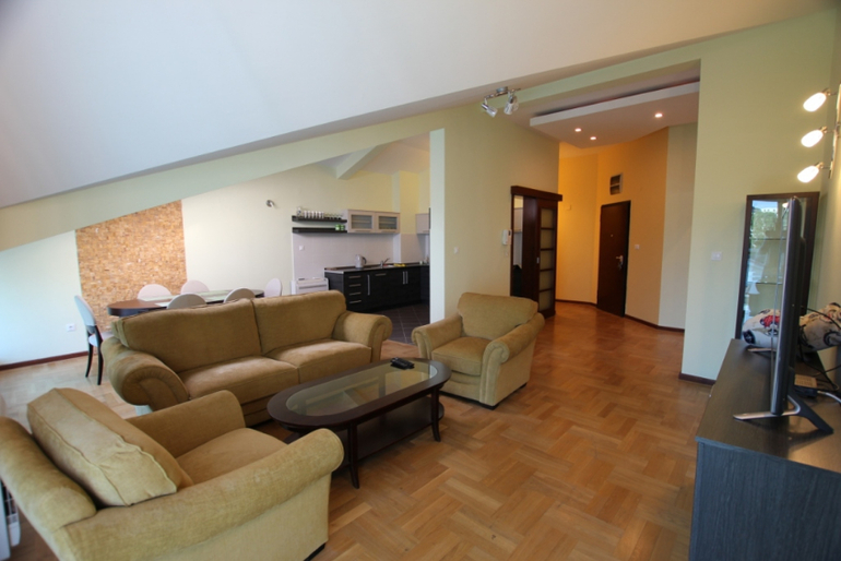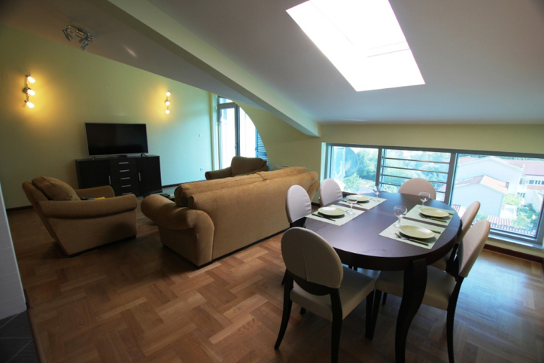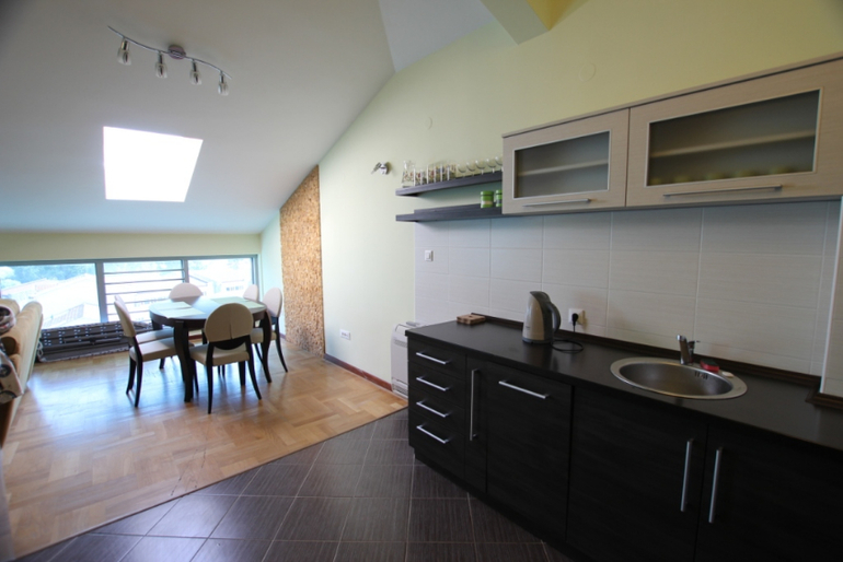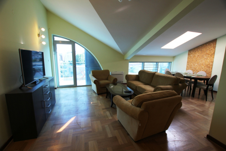 3-ух комнатная квартира мансардного типа - состоит из гостиной, 2 спален, столовой, кухни, ванной комнаты и террасы с видом на море. 5 этаж, дом оборудован лифтом, домофоном. Имеется все необходимое для проживания.