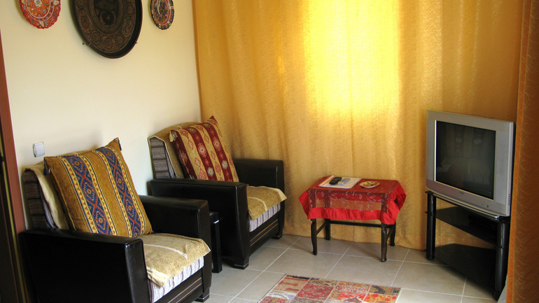 Апартаменты расположены в мини комплексе (всего 2 коттеджа по 4 квартиры) на приватной территории с бассейном и садиком, в тихом зеленом месте. Рядом нет больших дорог и дискотек. Апартаменты находятся на 2 и 3-ем этажах коттеджа.