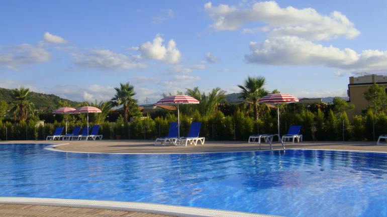 частный пляж с лежаками и зонтиками, 2 бассейна, водная горка, теннисные корты, футбольное поле, настольный теннис,детская площадка, паркинг, спортзал.