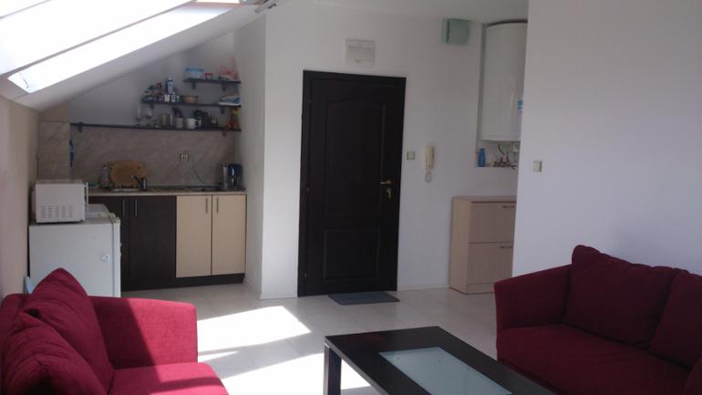 Первая комната - гостиная+кухня+столовая. В гостиной два раскладывающихся двухместных дивана, стол, стулья.