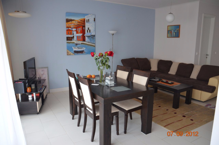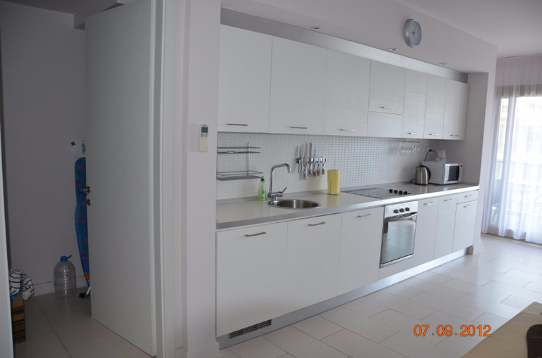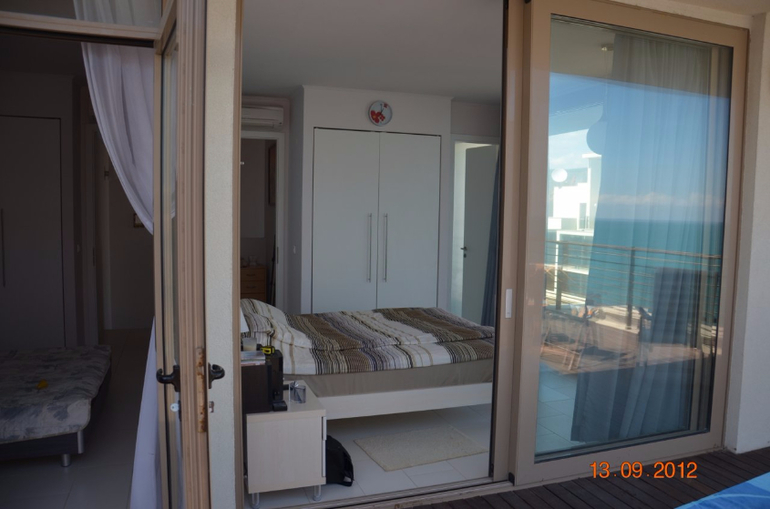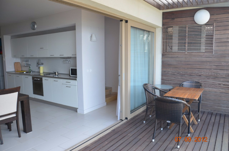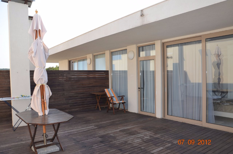Апартамент с прекрасным видом на море с двумя открытыми террасами.На первом этаже апартамента находится большая студио (гостиная и кухня), кладовая, туалетная комната и терраса оборудованная террасной мебелью. Кухня оборудована всей необходимой техникой и посудой. В гостиной большой раскладывающийся угловой диван, телевизор, муз. центр.