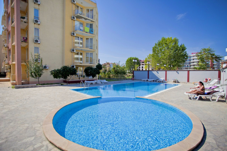 В комплексе: 2 бассейна взрослый и детский, бесплатные лежаки и зонтики, детская площадка, кафе с комплексными обедами.