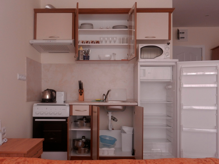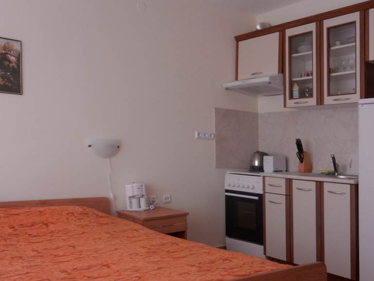В студии есть все необходимое для проживания и отдыха, 2 спальных места, вся техника, кухонный бокс.