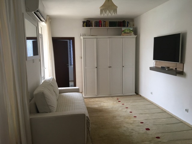 Квартира состоит из: студии с кухней, спальни и туалета/ душевой и большой террасы. В спальне двуспальная кровать, в студии - раскладной диван. Площадь позволяет проживать до 4-х взрослых.
