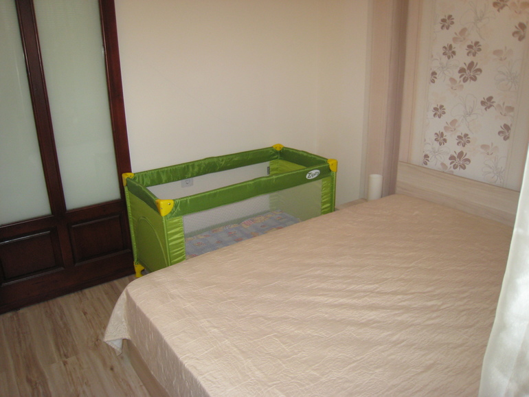 раскладная двухспальная кровать в гостиной детские краватки и стульчик для кормления кондиционер TV с русскими каналами 2 балкона постельное белье и полотенца