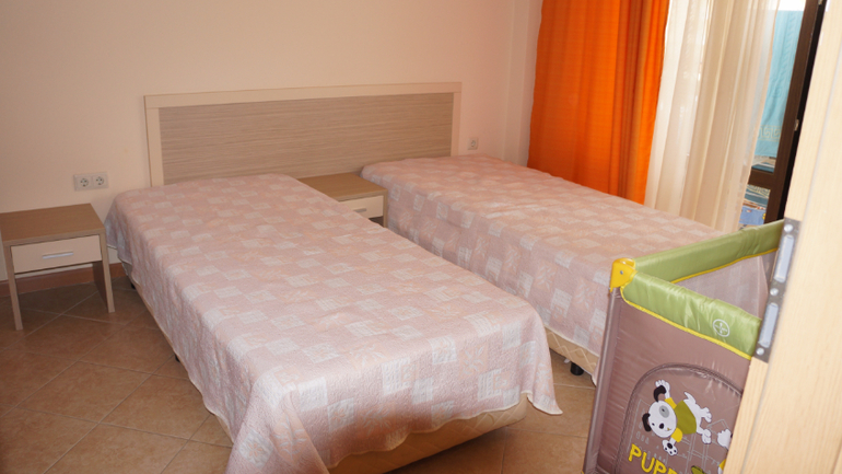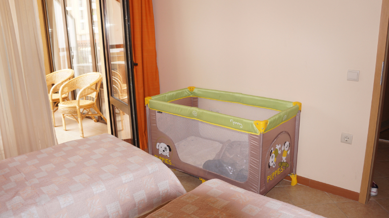 В спальне - две односпальные кровати (можно сдвинуть)плюс в наличии детская раскладная кроватка-манеж (т.е. возможно размещение до 6 человек, хотя оптимально 3-5)