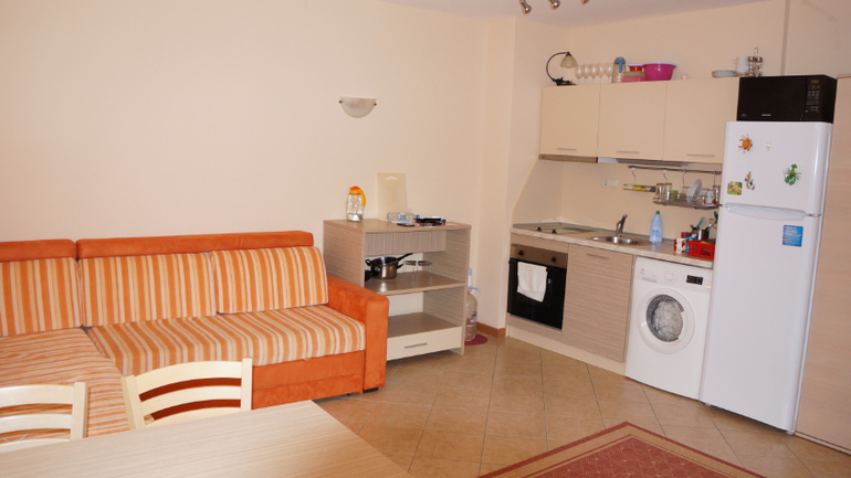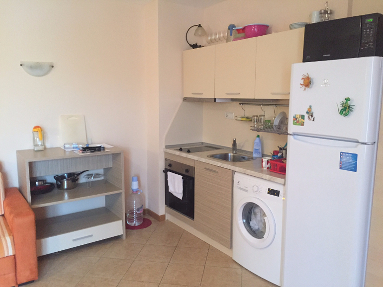 Оснащение гораздо обширнее, чем в стандартных номерах под сдачу - плита, духовка, большой холодильник, микроволновка, ЖК-телевизор с русскоязычными каналами, кондиционер, WI-FI-роутер (интернет оплачивается на ресепшн), чайник, кофеварка, стиральная машина, утюг, гладильная доска, пылесос, детское кресло для приема пищи, полный набор посуды для готовки и приема пищи