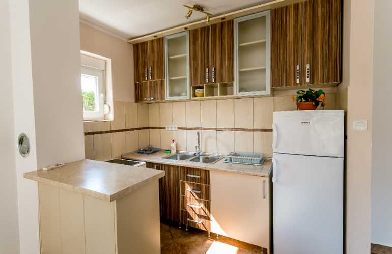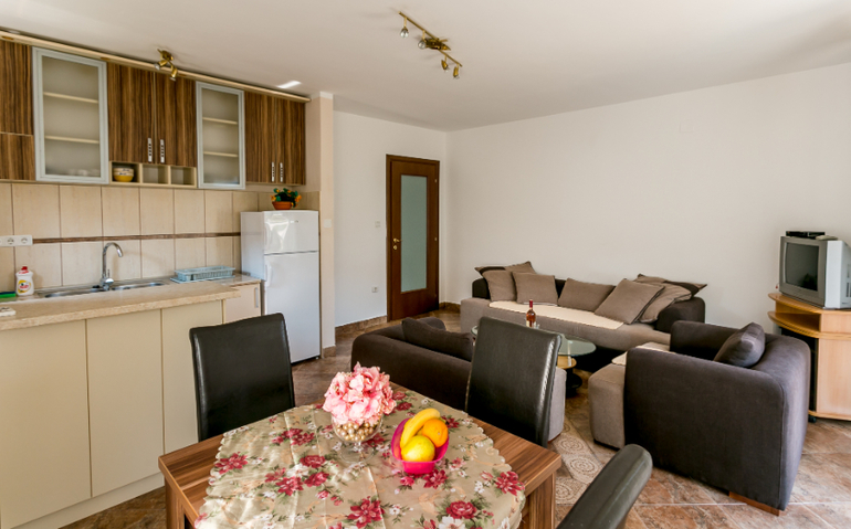 Апартаменты состоят из 2 комнат: гостиной с кухней и спальни. В гостиной раскладывающийся диван, два кресла, обеденная группа и полностью оборудованная кухня.