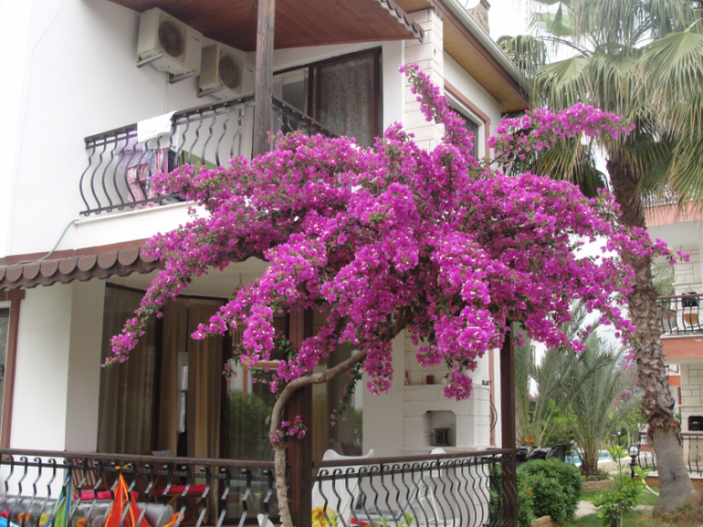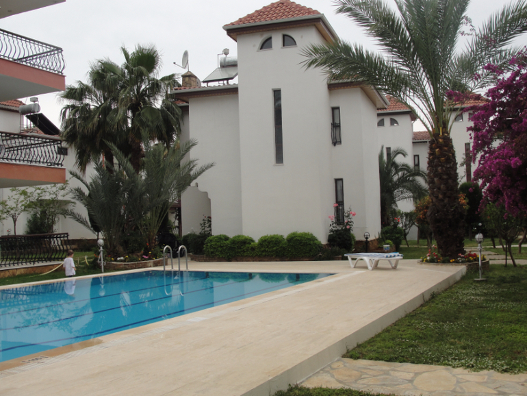 Комплекс засажен пальмами и плодовыми деревьями (лимоны, апельсины, гранаты, грейпфруты). Три спальни на втором этаже + ванна и туалет, первый этаж - кухня-столовая (+ туалет), с выходом на террасу и сад. Бассейн общего пользования - в 5 м от дома. В комплексе кроме нашей еще 10 вилл и два трехэтажных дома. Большинство владельцев - из Норвегии, есть также немцы, англичане и турки. Сезон - с мая по октябрь. Но в море можно купаться и в феврале ( вода около 19 градусов). Бассейн заливают 1 апреля и сливают 31 октября.